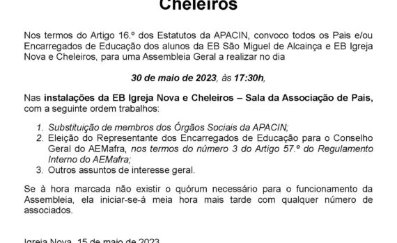Nos termos do Artigo 16º dos Estatutos da APACIN, convoco todos os Pais e/ou Encarregados de Educação dos alunos destes estabelecimentos de ensino, para uma Assembleia Geral a realizar no dia 24 de maio de 2017, às 18:00h, nas instalações da EB de Igreja Nova e Cheleiros com a seguinte […]